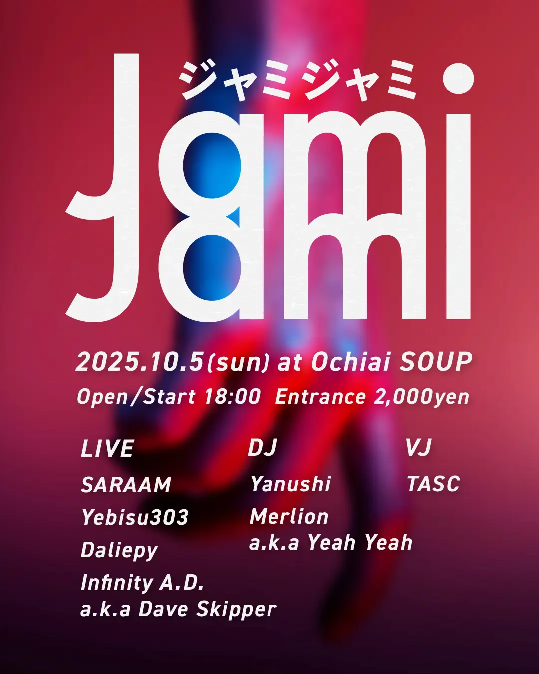 都内を中心に活動するDave SkipperとDaliepyが主催するJamiJamiが、約2年ぶりに落合Soupで開催。 今回も「エクスペリメンタルとダンスミュージックの融合」をコンセプトに、東京とソウルを中心に、アート・コレクティブやエレクトロニック・ミュージックレーベルなどで活動するSARAAM、無類のハードウェア機材愛好家であり、近年ではTVアニメの劇伴や電子楽器のプリセット作成を担当するなど活動を広げるYebisu303をライブアクトに迎える。 DJには、東京・神楽音にてテクノイベント”fueraput”を主催するYanushi、ベースミュージックを中心に重低音を得意とするMerlion a.k.a Yeah Yeahをラインナップ。 今回イベント初のVJには、グラフィックデザイナーと楽器制作/ミュージシャンによる、音と映像を即興的に再構築するインタラクティブな映像ユニットが出演する。