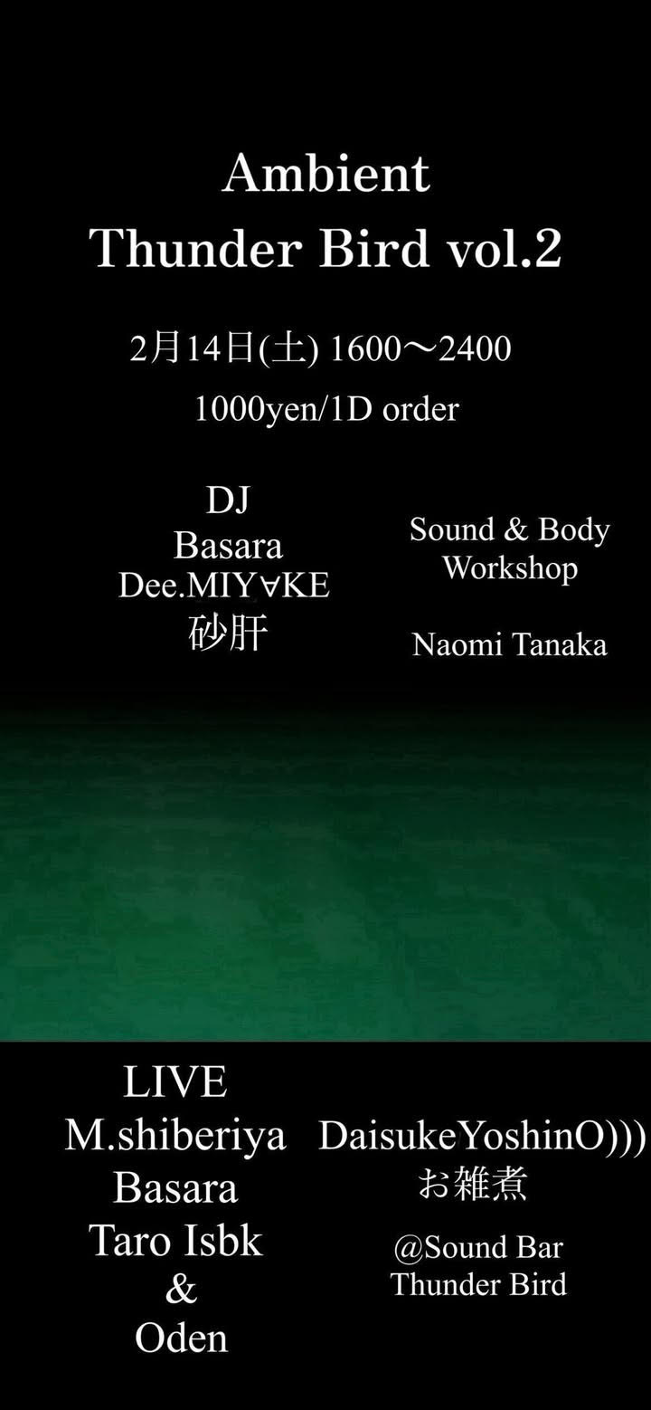 16:00 - 23:00 Ambient Thunder Bird 02/14 |16:00 Ambient Thunder Bird 2/14(土) OPEN16:00 ENT \1000+1D Order 1600〜1630 Naomi Ta […]