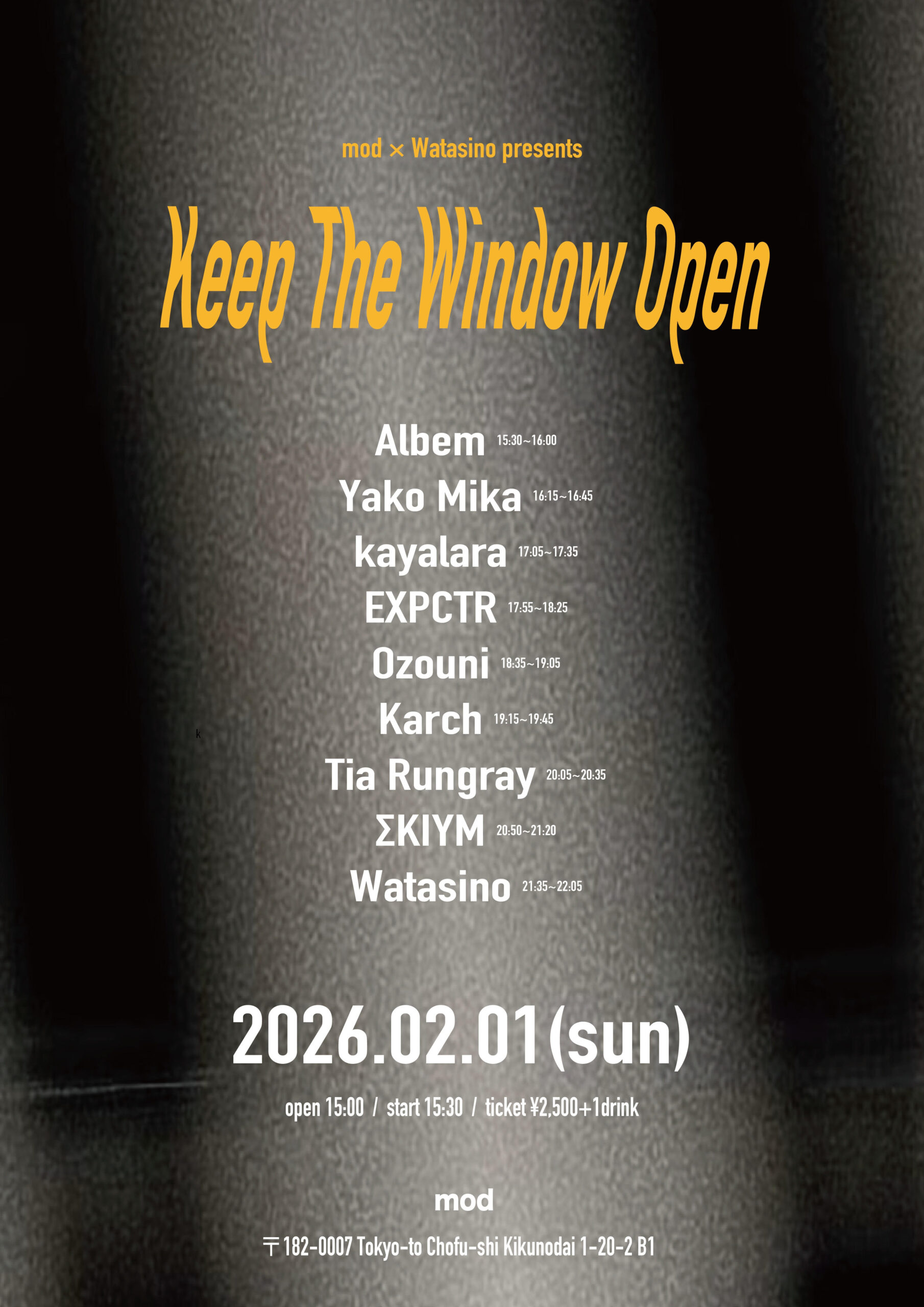 15:00 - 22:00 mod × Watasino presents「Keep The Window Open」 02/01 |15:00 mod × Watasino presents「Keep The Window Open」 LIVE: Albem Yako Mika kayalara EXPCTR お雑煮 Karch Tia Run […]